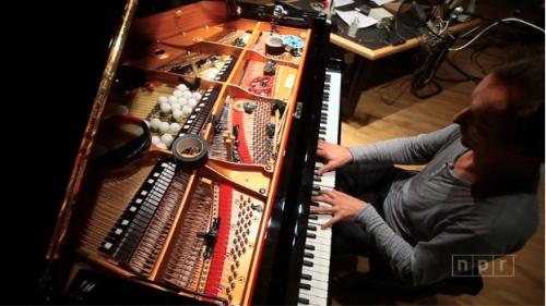 You often hear talk of prepared piano but it is nice to see a guy making excellent music using the technique. In this video you can now also see it. Using tambourines, mini-cymbals, and yes, ping-pong balls, Hauschka demonstrates how to use prepared piano to make a brooding piano piece.