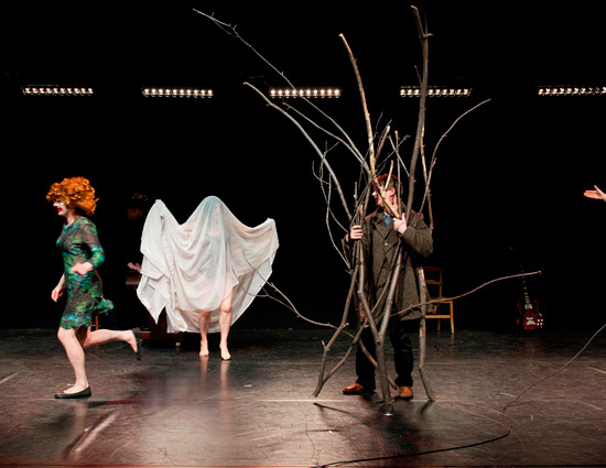 Forced Entertainment’s production of ‘The coming storm‘ is a a loose and free flowing piece of theatre, which is enjoyable and well paced. It develops slowly from the initial scene with six people (three men and three women) entering an empty set, which has various rails of costumes and other odd ball items (branches of a tree, a drum kit, a crocodile costume etc) at either side.