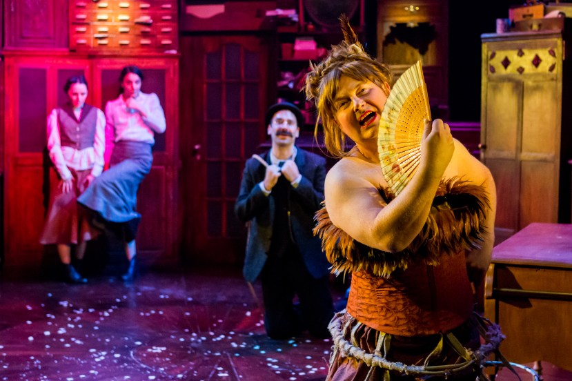 The circular stage is filled with various wooden doors, book shelves and other oddities from the age where the novel is set. The doors allow for the actors to flit on and off stage, as the scenes change by the second which creates a lively feel. There are heavily choreographed sequences throughout and also song which work well.