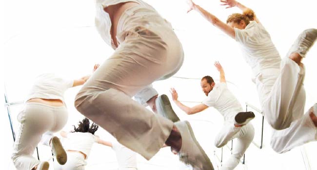 The opening scene involves a single dancer on stage with no music, whirling a massive flag above and around his head. You hear the ripple and slap as the fabric beats the air and as he pulls and drags the flag. The staging is simple with a number of columns at the sides of the stage and a white backdrop. The lighting is used effectively throughout, with light and shadow thrown to all corners of the stage. The shadows the dancers throw as they move are one of the main visual images, and some of them are quite beautiful to watch, you can even end up watching the shadows and not the dancers on occasion!