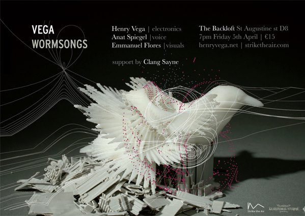 ‘Wormsongs’ is a new musical work for voice, electronics and live visuals, performed by composer Henry Vega (electronics) and Anat Spiegel (voice), and accompanied by real-time visual projections by video artist Emmanuel Flores. Inspired by Spiegel’s distinctive voice and a variety of vocal traditions such as religious intoning and spoken-word, Vega orchestrates streams of automatic sound with vocal parts to match, creating a digital language that spans the spectrum from noise to pure sine in a style he describes as micro-minimal with a passion towards machine-kind.