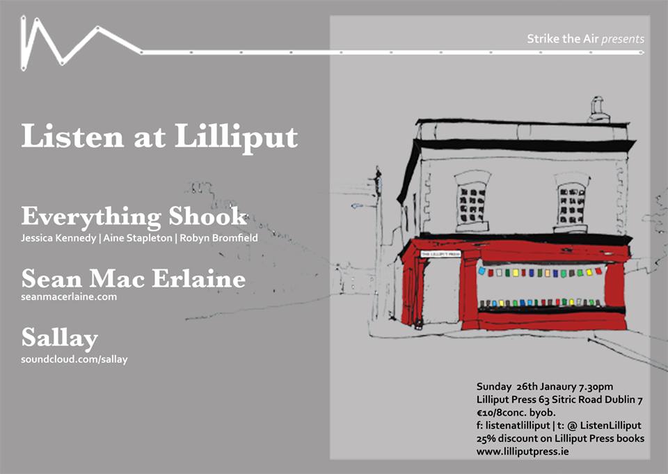 It’s only three days until this months Listen at Lilliput, and it’s not to be missed. With Everything Shook, Sean Mac Erlaine (This is how we fly) and Sallay will perform in one of the coolest venues in Dublin. For those that don’t know, Lilliput is actually the home of Lilliput Press, the publishing house responsible for Donal Ryan’s ‘The Spinning Heart’ among others. It’s a lovely spaced filled with books!