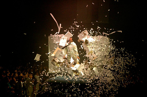 The actors, dancers, acrobats or whatever you want to call them mainly appear on a travellator, with the man in the white suit walking and running against the machine. Objects and individuals are fired at him, and he avoids each of them as they shoot past, and fall behind at the end of the machine. At other times, acrobats on wires run on a curtain draped around the venue. They do cart wheels as they are tugged from one side of the venue to the other. Sometimes the show is pure dance, with the performers showing their moves on industrial style scaffolding. In the most spectacular sequence, a swimming pool is lowered from the ceiling, and you can see the performers slide and splash about in the waters above.