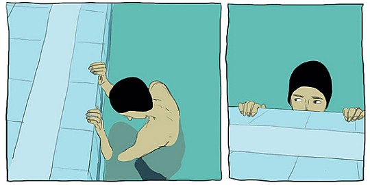 This graphic novel is all about the illustration. It is a book that focuses on capturing a world and everything in it. The choice of pigments in the book is extremely limited. While it is in colour, these are restrained to a choice few, and mostly the strong blues, blacks and whites that are obvious in the images attached. There is a distinction between the world when his head is above the water and that where it is below. Above the water, the images are clearly delineated, with black outlines around everything. Under the water, it is a much looser world where people and objects become fluid. The artist and writer, Bastien Vivès aims to capture the light and sound of the swimming pool, and that is where the graphic novel excels.