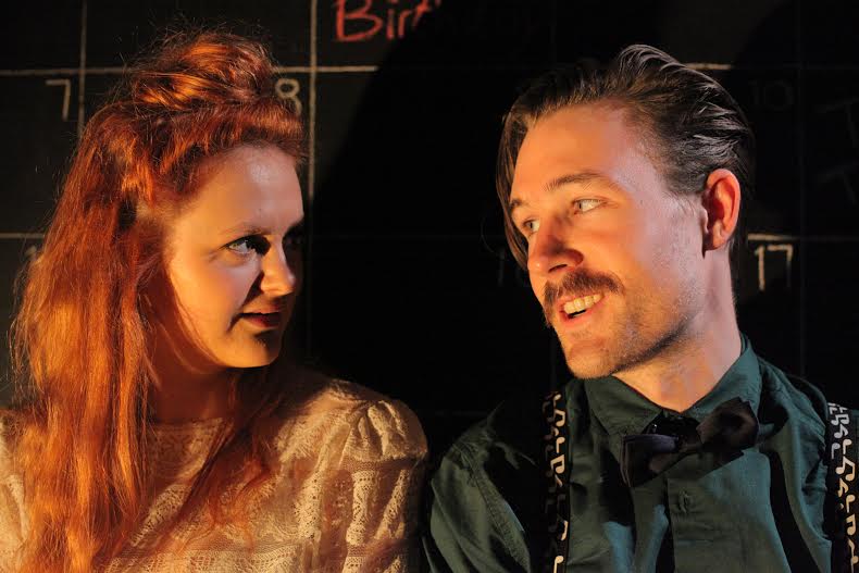The set consists of two guitars and various percussion instruments, some of which you can sit upon. The back wall of the set is a large calender in rectangular shape. Some of calender’s squares are filled in describing what is due to take place on a particular date. There is a sign hanging over the calendar stating the month which the actors change to identify the passage of time. As the lights go up the actors assemble the drums and guitars as if they had just obtained possession of a new apartment and are making it into their new little nest. They are, however, on the verge of a row caused by one long-legged Josie who works with Lennon (Laurence Falconer) and with whom he has certainly held hands and if Nora (Kate Gilmore) has been told the truth by “a friend” may have even kissed.