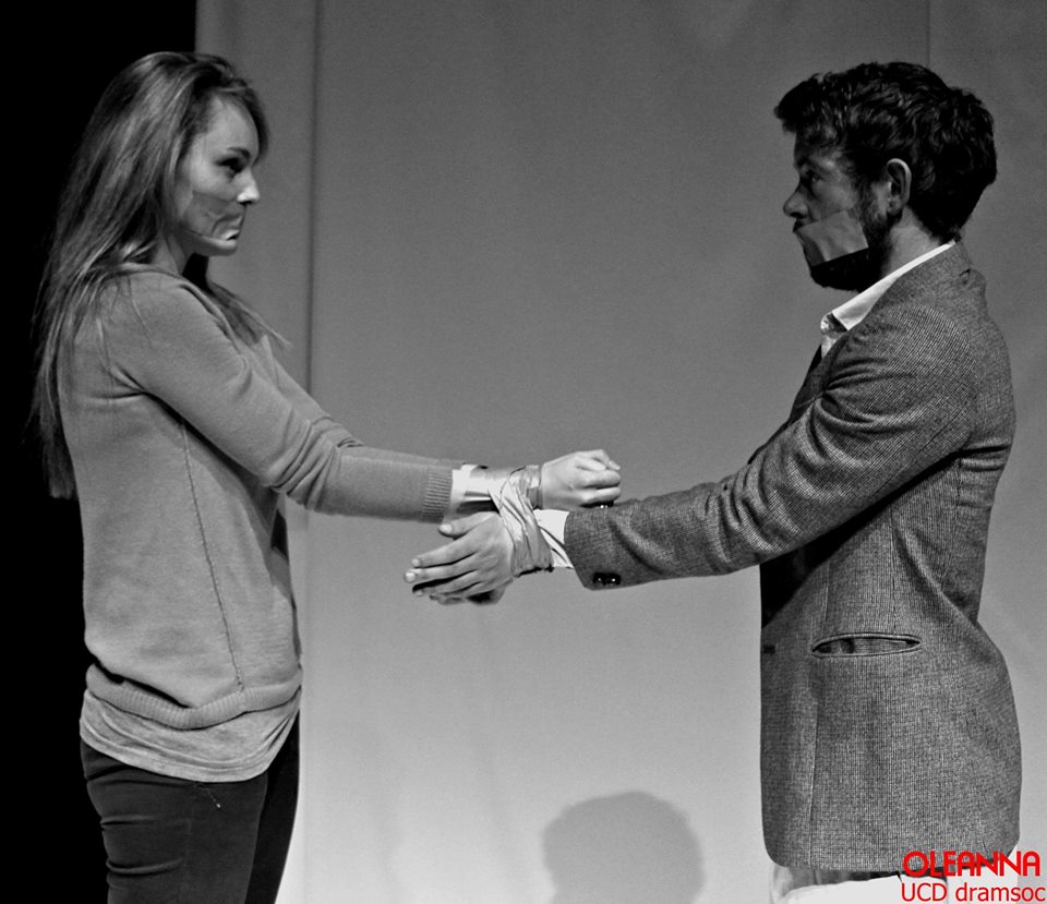 Last night was opening night in Dramsoc’s production of Oleanna. Dramsoc is putting it’s new theatre to good use by producing a summer show to highlight the societies wealth of talent. Today ex Dramsoc members are treading the boards from Dublin to Broadway, earning Tony Award nominations and Emmy’s. A two hander, such as Oleanna, with its stark staging, gives the actors no where to hide. They must be pitch perfect, completely natural and draw the audience into this story where the audience must act as witness, deciding who is telling the truth. The director, Ciaran Gallagher, made the bold choice to give the play a soundtrack of a ticking clock, the metaphor for the ticking time-bomb about to explode onto the stage. However the effect was somewhat lost in the looping of the sound, where it faded out and in again not necessarily in tempo. Gallagher admits in his directors notes in the program that the show, produced hundreds of times by professional and amateur companies, can struggle to find a fresh approach and vision. He and his producer explored different ways in which to make the production feel fresh and up to date. The staging was very simple and I was struck by how much like the UCD academic offices it resembled, rather than the plush offices held by Ivy league professors. However, I think there would have been merit in producing the play with it’s original ending.