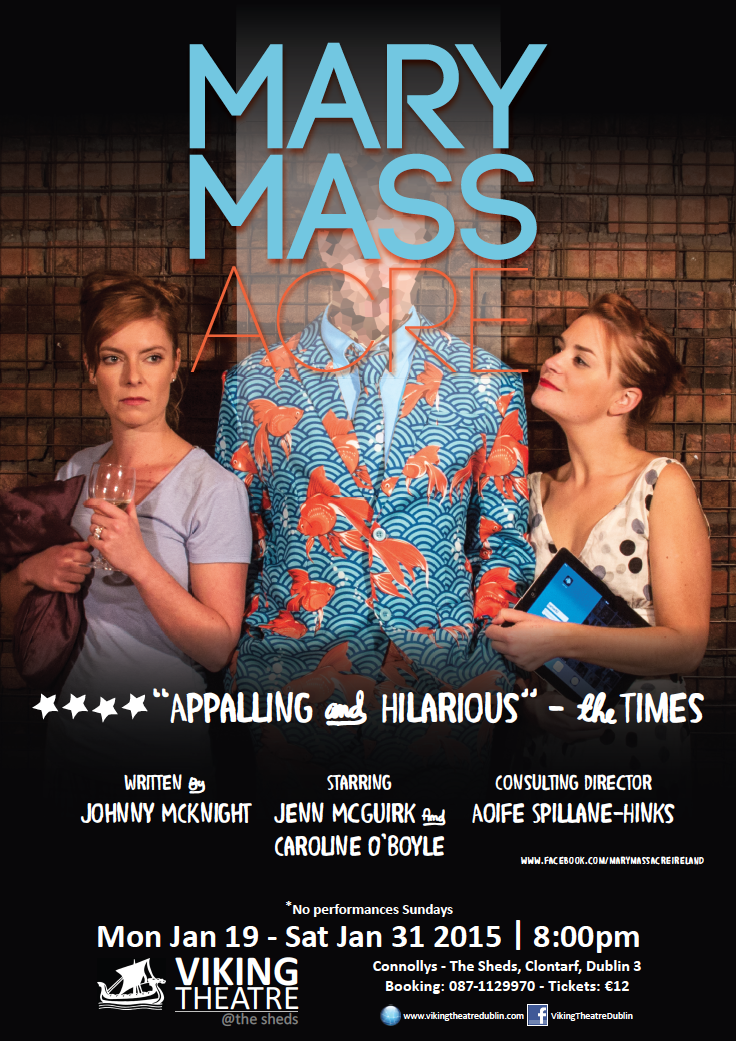 The Viking Theatre is one of those intimate spaces that should be applauded for their very existence. No doubt operating on a tight budget, looking at their website they seem to be bring a constant stream of interesting new theatre to the greater Dublin audience. In a venue of this sort you can expect intimate story telling, an altogether different experience than seeing a piece on a larger stage. This was my first ever visit to the Viking and it didn’t disappoint. MARY MASSacre is the story of Jenny, an alcohol-dependent housewife at the end of her tether, she is also at the end of her relationship with husband Gavin and Layla, a ‘thirty-something’ Argos worker, looking for love on-line. In this often bitingly funny and sometimes heart-wrenching piece, written by Johnny McKnight, Layla will unwittingly discover the tragic secret at the heart of Gavin and Jenny’s shattered marriage.