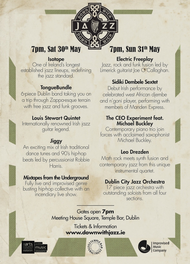 10 great acts over 2 nights in Meeting House Sq, playing jazz and experimental music, including established Irish jazz acts like Louis Stewart, Hugh Buckley and Dublin City Jazz Orchestra