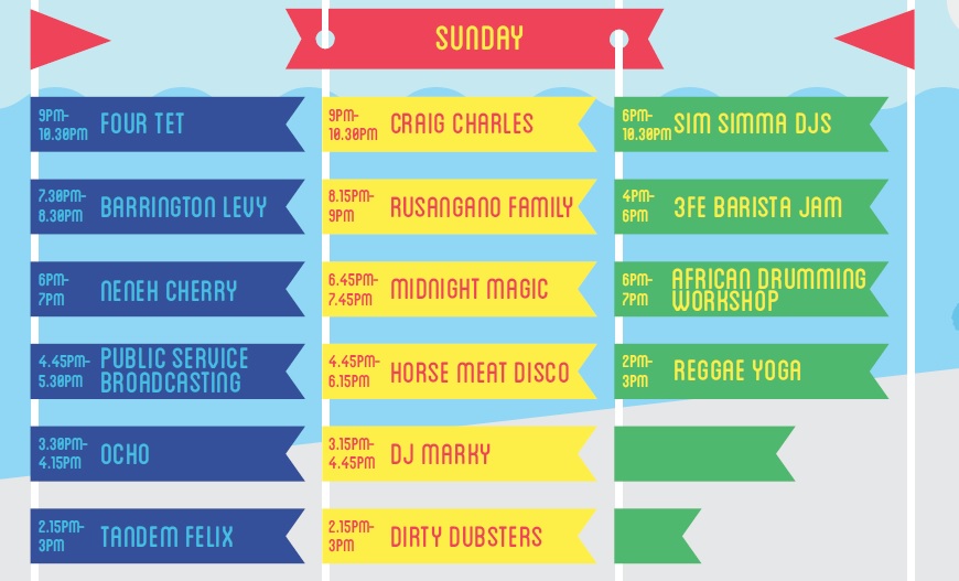 Providing the musical entertainment will be Sister Sledge, Four Tet, Neneh Cherry, Barrington LEVY, Madlib, Slum Village, PUBLIC SERVICE BROADCASTING, Lindstrom, Craig Charles, Optimo & Mister Saturday Night B2B, Dj Marky, Horse Meat Disco, I Am The Cosmos, Le Freak, RiZA, EMBRZ, Telephones, Tandem Felix, Sim Simma, Rusangano Family, OCHO, Faune, Dirty Dubsters and more!