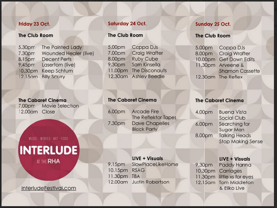 Details of the Interlude festival at the RHA have just dropped and it looks more than a little funky! There are DJ’s and a Cabaret Cinema showing “independent movies such as Arcade Fire’s The Reflektor Tapes”. It’s also smack in the middle of October, when things slow down again. Check out the details below…