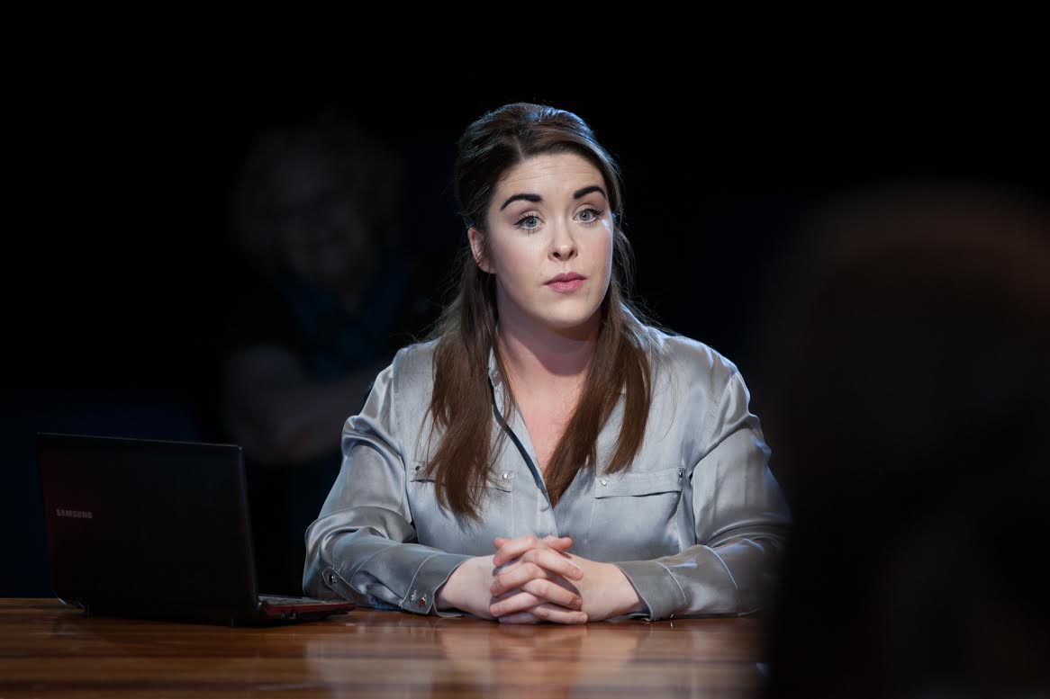 Bewley’s Cafe Theatre is reconfigured by designer Aedin Cosgrove as the chairs for the audience line the perimeter of the four walls with one or two utilitarian tables sporadically placed in front of them. In the central void is placed a nondescript chair in front of a manager’s desk with a laptop situate on it. There is another office chair at a distance facing the desk. A nameless manager is seated behind the desk and Emma, a newish employee in sales, has been summoned to her office. After just about polite preliminaries, Emma is asked to read clause 5 of her contract. It states that an employee is not permitted to have a sexual or romantic relationship with another employee without informing the company. The manager goes to considerable lengths to ensure that Emma understands the full import of Clause 5 as interpreted by the employer. The manager demonstrates from the beginning a stony demeanour which is reminiscent of another great bloodless fictional creation Mrs.Danvers in Daphne du Maurier’s “Rebecca”. She and the corporate employer have power over Emma. Amorally and monstrously she misuses that power. In this deeply unequal contest Bartlett manages to create a great deal of humour while never losing site of the torment that Emma has to endure at the hands of her manager. At all times the manager appears to operate, just, within the terms of the contract. It is an Orwellian world.