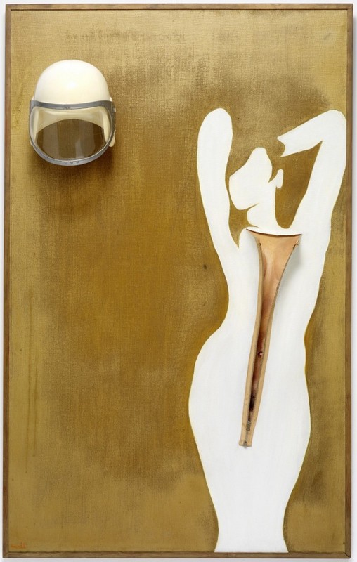 There are some eye grabbing pieces here. Ushio Shinohara’s 1966 Doll Festival uses the bright cartoonish style of pop art and mixes it with Japanese traditional style and myth, a comment on the way American culture has invaded Japanese cultural values. In room 1 Valentine by Belgian artist Evelyne Axell uses plastic and found objects to conflate space exploration and the burgeoning sense of women’s sexual liberation. Judy Chicago’s car hoods painted in dayglow colours with cartoon female genitalia conflate the two male obsessions.