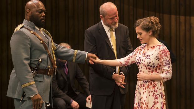 Othello is played by Peter Macon in this production, a role he is quite familiar with, having played it a number of times previously. Macon has a commanding voice and powerful stage presence that is rarely seen on the Irish stage and is very impressive in the role. The other main character is that of Marty Rea as the conniving, duplicitous Iago and the two carry the production with style. Rebecca O’Mara plays Desdemona as a wide-eyed innocent, lost in love for her husband and failing to see the forces arming against her. This is a rich and layered production that is largely carried by Macon, moving it from the mundane to the remarkable.
