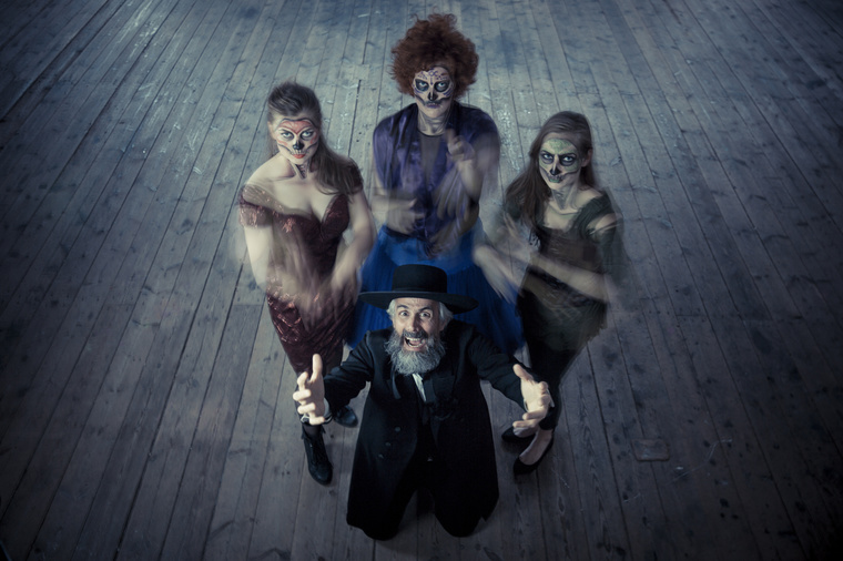 The stage of Theatre Upstairs is compact. The set comprises an empty wooden doorway which projects to the front of the stage. The set also has a full-sized key board, a stand on which a saxophone rests plus a set of drums. There are in addition four actors who play a variety of musical instruments. The principal is Legg (Roger Gregg) who represents a series of individuals who personify certain human vices, namely ignorance, pride, fear and greed. They are Serpent Demon (Alicky Hess), Jezebel Demon (Juliette Crosbie) and Sorceress Demon (Madi O’Carroll) and each of them has their face painted. He is dressed in a black suit with a flat cowboy hat. The Demons wear lascivious costumes which have tones of what might be seen in a cowboy saloon bar. Legion morphs through various guises such as an old-time preacher, a con artist and other unsavoury characters speaking in an American accent emanating from the South. The three Demons move around the stage often in suggestive poses and are in effect supports for Legion’s motley collection of characters.
