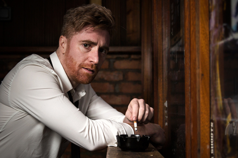 A strikingly imaginative set – a backdrop constructed from wineglasses suspended from fishing line or similar and tiny fairy lights – marks the attention to detail in Amilia Stewart’s direction of Ken Rogan’s ‘Hero’, a one-hour, one-act play receiving its premiere at Theatre Upstairs for Lakedaemon theatre company. The actor is silhouetted, stock still against this backdrop, beer bottle in hand in some kind of lounge bar as we listen to That Old Black Magic Called Love. Love certainly has Smithy, our maybe-hero, in its spell as round and round he goes… As the action begins we have The Way You Look Tonight – played right through and too loudly so that the actor has to contend with the words of the song, an unnecessary distraction. It’s a song best avoided in plays since its inspired use in Brian Friel’s Faith Healer. This is the only jarring note in an otherwise excellent production, and it is a very minor quibble.