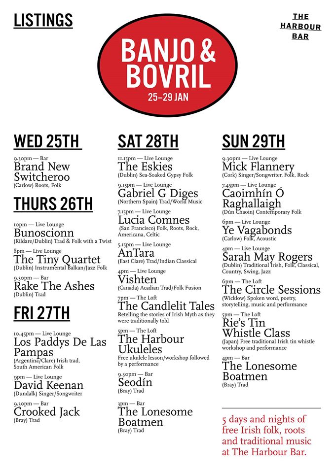 A great little festival if you’re anywhere near Bray this week, is the wonderfully names ‘Banjo & Bovril’ Festival in the Harbour Bar, Bray. It includes acts such as Mick Flannery and Caoimhín Ó Raghallaigh, so not to be missed. The best thing is that all gigs are free! Candlelit Tales will also be performing. Check out the full details below.