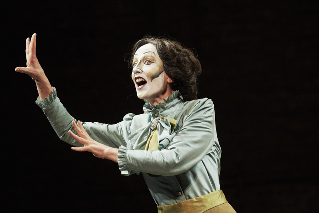 This is a new production by Corn Exchange, who originally produced the play in 2004. This production uses many elements of the original and has the same director in Annie West. It keeps some members of the original cast, with Louis Lovett and Karen Egan returning. The rest of the cast comprises a younger generation of Irish talent including Caitríona Ennis who was recently nominated for Best Actress in the Irish Times Theatre Awards. The original commedia dell’arte performance style is maintained, with the actors appearing with white faces and talking directly to the audience. There is a cast of six and yet at times it seems the stage is full of people.