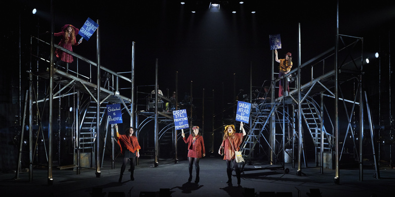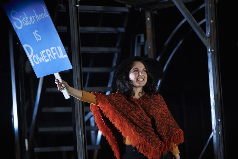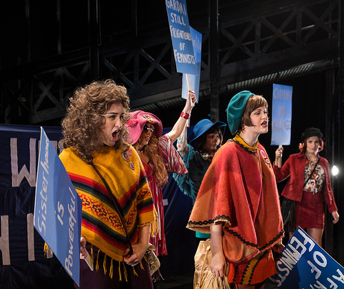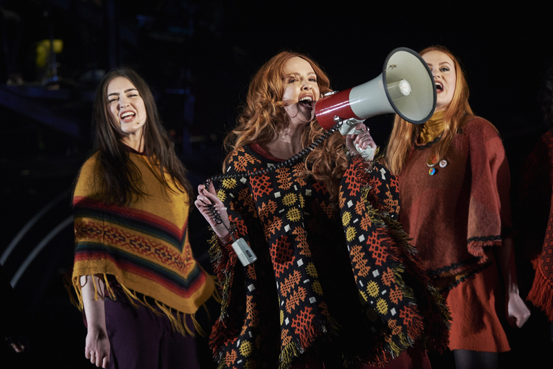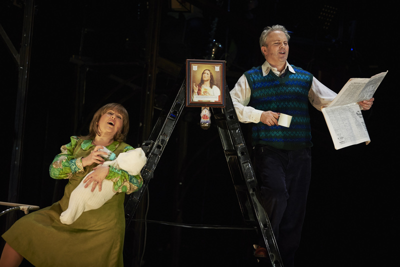 With book and lyrics by Arthur Riordan and music by Bill Whelan, its point of departure, and arrival, is the furore surrounding the train taken by members of the Irish Women’s Liberation Movement to Belfast in 1971 to import contraceptives “in direct contravention of the will of god” – and of Irish law. A ‘chorus’ of five young women actors – Sophie Jo Watson, Karen McCartney, Kate Gilmore, Danielle Galligan and Lisa Lambe – combine narration, choral commentary and participation in the action. Their solo songs and duets provide some of the most moving moments, laughter giving way to quiet introspection, reminding us of the grim reality of women’s lives in those days – and for a long time afterwards.
