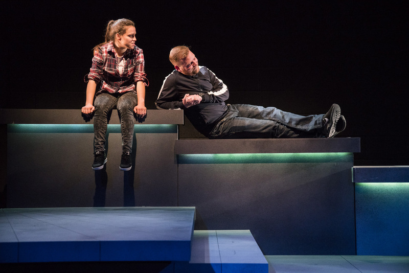 The set (by Maree Kearns) and lighting (by Sinead McKenna) combine to create an adaptable space. It is a series of ascending platforms, along with an upstand at the back wall, which was used to create the inside of a Luas, a public house and a bridge.