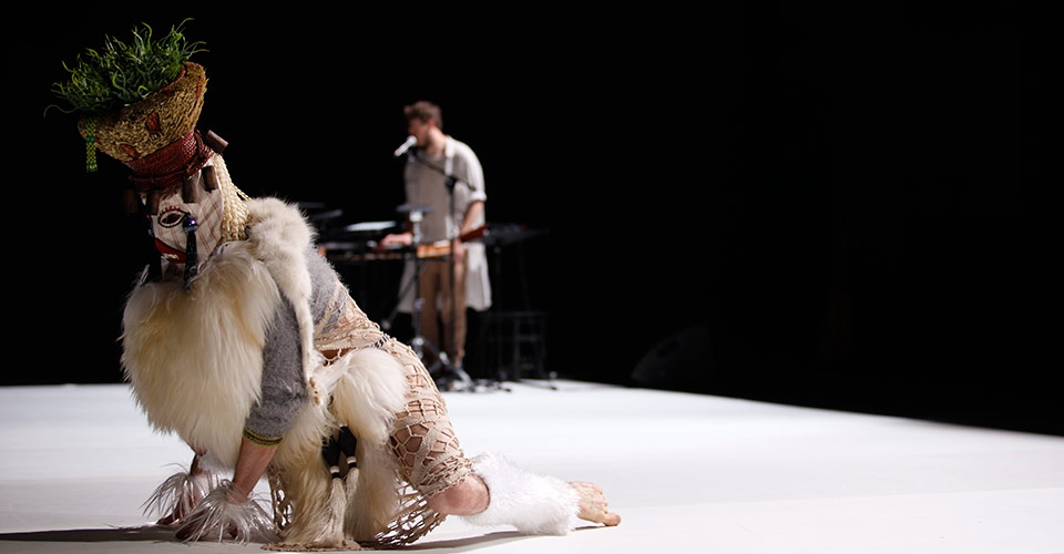 As the audience enters the auditorium the stage is bare apart from a keyboard. A figure enters unobtrusively on the left hand side. It is definitely human, wearing a mask, but is reminiscent of a wren boy that would make its traditional appearance on St Stephen’s Day. However its apparel is mostly white, made predominantly of fun furs. On its head, a plant in a wicker-like basket is perched. It appears to be insecure. After a while, the figure with slow measured steps moves across the stage. He becomes definitively male. Each of his toes are relevant to his slow advance; it is a mannered progression. He becomes more animated and like a Wren boy, the tinkle of bells can be heard in his movement. Then on the right hand side of the stage the remaining nine dancers appear, huddled like school children, along with Awir Leon. They all proceed towards the keyboard of which Leon takes possession.