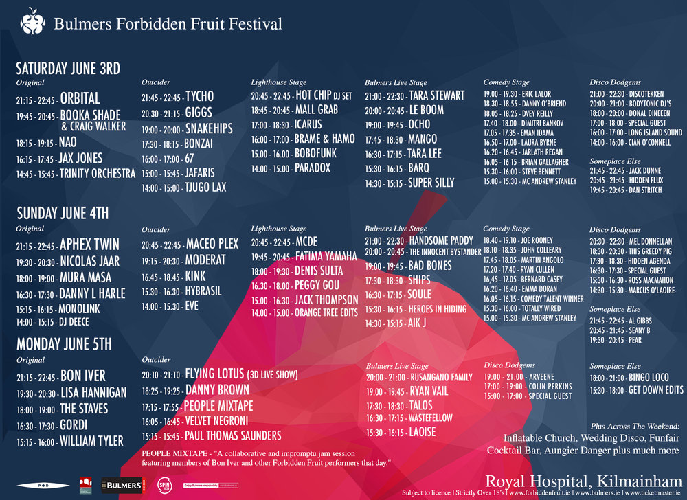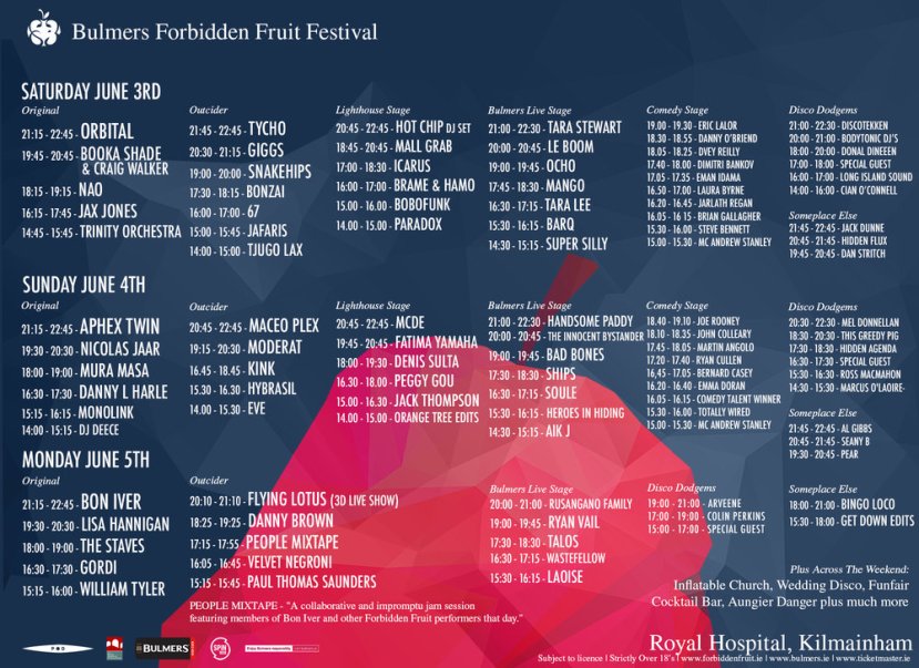 Festivals Bulmers Forbidden Fruit 2017 – Stage Times By No More Workhorse on May 30, 2017 • ( Leave a comment ) So, you’ve been counting the days, minutes and hours, and it’s finally arrived! Check out the full runners and riders below. Share this: Click to share on Facebook (Opens in new window) Facebook Click to share on Pinterest (Opens in new window) Pinterest Click to share on X (Opens in new window) X Click to share on Reddit (Opens in new window) Reddit Like Loading... Related Categories: Festivals, Gigs, Header, Music