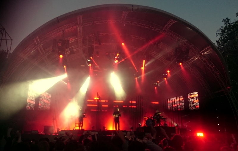 Alt-J are now a three piece, with the departure of bass player Gwil Sainsbury in 2014. They had an unusual arrangement on stage, with the drums brought to the front and not hidden at the back. The three members of the band arrived on stage at 9pm to start their set. It was a slow beginning with the opening track of their new album, 3WW, which has a long instrumental introduction before the vocals are introduced later (complete with a section from The Auld Triangle). The set kicked off properly with Tessellate, with the lyrics ‘Triangles are my favourite shape, Three points where two lines meet’ inspiring most of the crowd to make triangles with their hands.