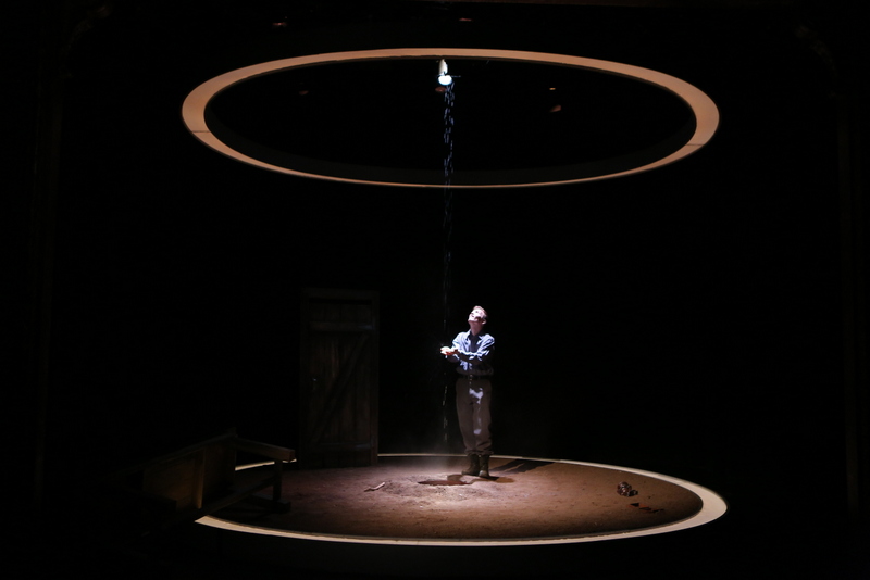 The set for the play by Colm McNally is quite striking. All the events take place in a chapel, which is a pagan place that has been left to ruin on the island. There is a door showing the entrance to the space and a simple dirt floor. There are two illuminated circular bands, one on the floor and one hanging above the actors heads, creating the walls. Two musicians lurk in the darkness at the back of the stage. They play a variety of instruments such as piano, drums and saxophone. The music is used to create the bird life on the island, but also to highlight the moments of tension.