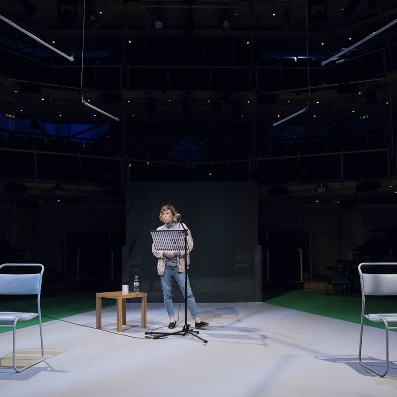 After a short introduction explaining the series of plays and what they aim to achieve, Stacey Gregg arrived on stage from her seat in the front row of the audience. It was a solo performance and she stood behind a podium with a microphone for the most part, but she occasionally left it behind to come forward and talk directly to the audience. There were two chairs on stage along with the podium, although these were never used! They may have represented the two main characters in the stories.
