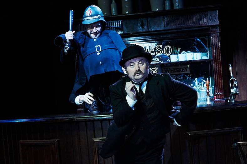 The Abbey is transformed for this production. There are seats at what would normally be the back wall of the theatre. There are also chairs and tables on the stage itself that allow the audience to be face to face with the actors, immersed in their world. There are minimal props used, with a bar at one side and Molly’s bed centre stage. There is also a piano at the other side of the stage which is used for the musical numbers.