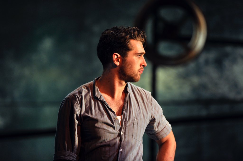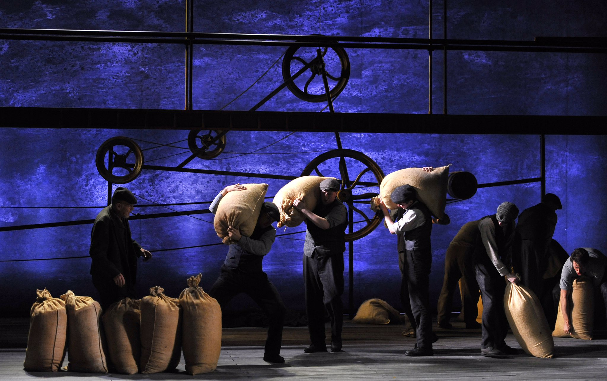 The set shows spinning cogs and wheels, possibly of a mill, along with a flight of stairs leading to a walkway above the stage. There are a number of locations including bars and houses, but they are created through lighting and props rather than anything more elaborate.