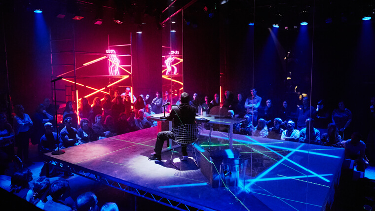 Despite the warning on the Abbey website, this is not a standing performance. You enter the Peacock from a different door at the start of the production and have a short walk at that time before taking your seat! The performance is in the round with seating on all four sides and a raised platform at the centre of the theatre. There are also some nice touches with Neon signs and other effects around the theatre.