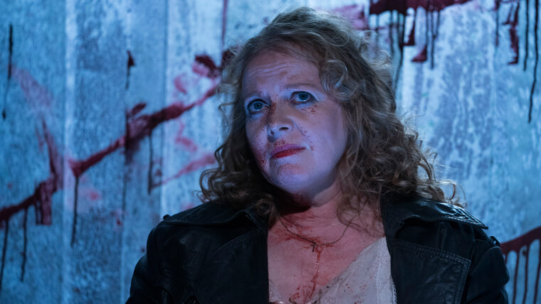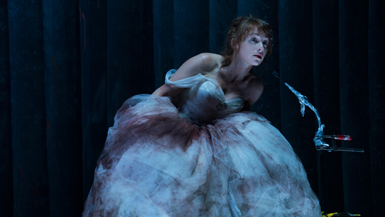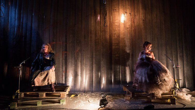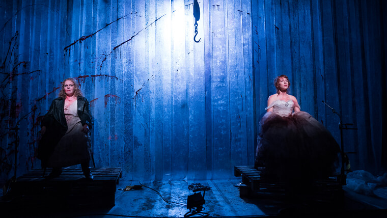 The initial image of ‘What Put the Blood’ is quite unsettling. The two actors are already on stage as the audience arrives into the theatre. They sit at the very front of the stage tied to their chairs, as two brides in bloodied wedding dresses. The front of the stage is filled with steel hooks and chains and the back is barely visible through blood splattered plastic sheeting. It gives the impression that the cast members are held captive in an abattoir. There is heavy rock music playing as you take your seat. All quite unusual for a night at our National Theatre!