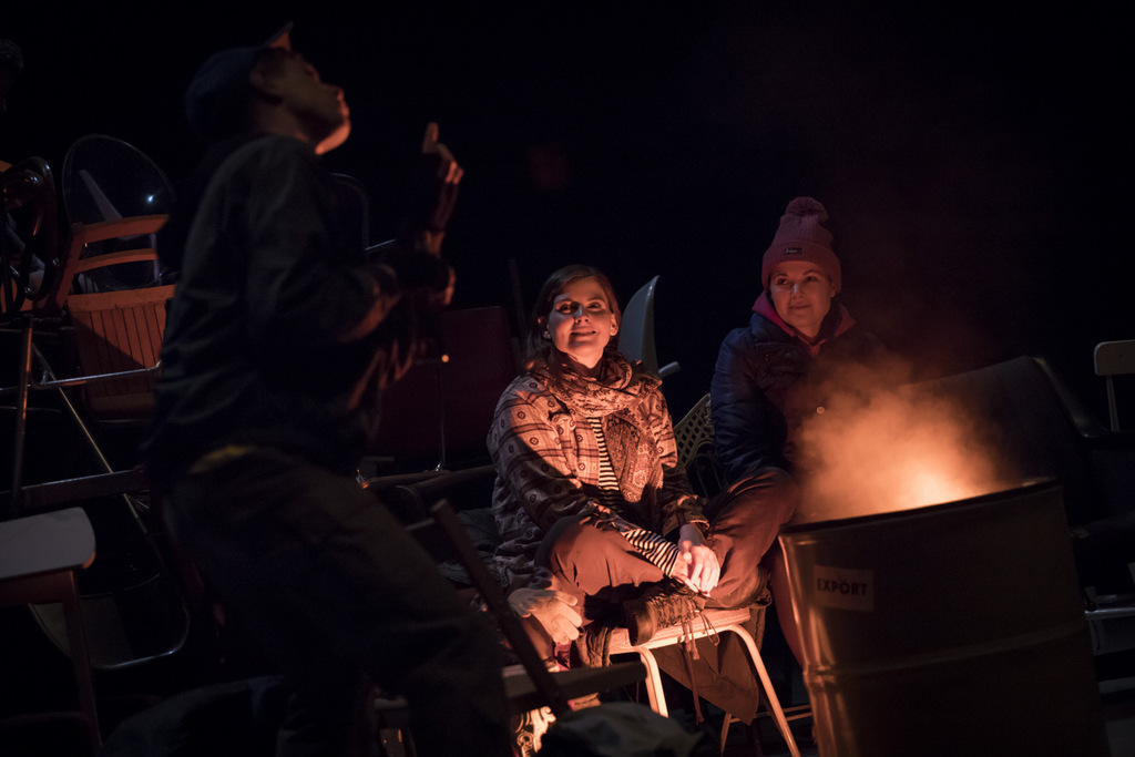 At its best, the play digs right to the core of the human impulse towards creative expression. Nessa Matthews’ charming but fragile Maria pleads with her fellow players, ‘Are we just entertaining them? We have an opportunity here to provide meaning.’ The struggle for validity and self-worth each artist faces every day. Instead of suggesting any answers, the play details the process in action. The group huddled round the campfire tell their story together, as the earliest humans once painted pictures of animals on cave walls. Through the three acts the re-enacted story develops from this hazily remembered campfire tale, to a polished pop-rap-operetta, and thence to the level of tragic Greek myth. Washburn reminds us that in order to both create a society and to understand that creation we must constantly tell and re-tell our stories through whatever means are at our disposal.