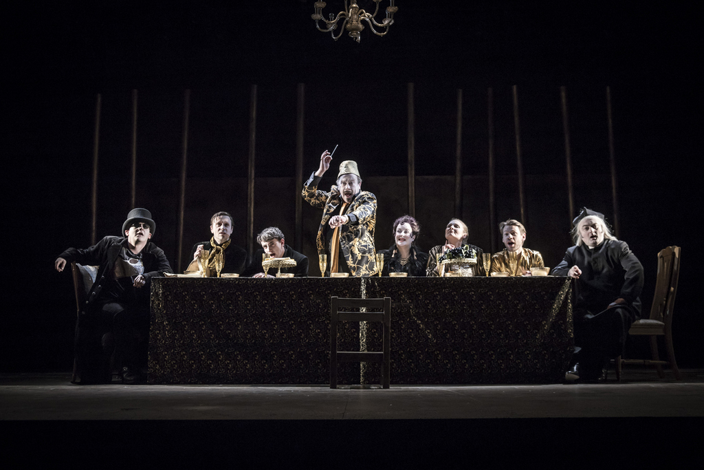 What is most striking about the production is the work of set and costume designer Monica Frawley. The set design is stark with simple backdrops moved manually by various members of the ensemble to create the locations required. But the alternating scenes evolve so stylishly that it is a joy to behold. The costumes are lavish especially for the major social events, showing the vulgarity of social-climbing Mariella and her cohorts. There are also a succession of marvellous visual gags which create a great deal of merriment. There is a sense of the macabre throughout with hints of Tim Burton’s visual style.