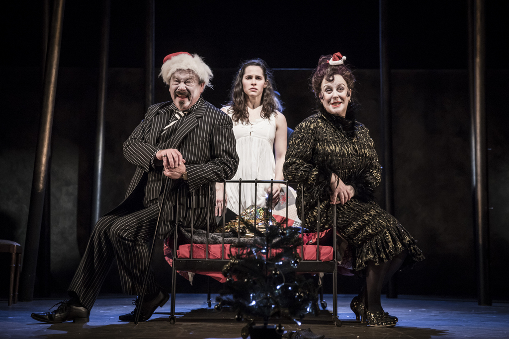 We realise that this is not a conventional Christmas story right from the off. The play starts with a funeral! Karen (Stephanie Dufresne) is left an orphan after the death of her mother. She is taken in by the local priest (David Pearse) who finds her “a good home” with a rich couple. They are Bob (Owen Roe) and Mariella (Marion O’Dwyer) Nugent. He is a distant cousin of the deceased and works as a developer while she is a socialite. Mariella is seeking to engineer herself onto the board of a charity which works with orphans and she hopes this act of generosity will be sufficient to sway those whom she needs to influence. She invites the members of the board to a dinner party in her home, where she will introduce the orphan. Karen needs a decent pair of shoes for the event. Mariella despatches Karen along with her old housekeeper Mags (Rosaleen Linehan) to a famous shoemaker (also David Pearse) to get a pair of plain, respectable shoes. However, all does not go to according to plan.