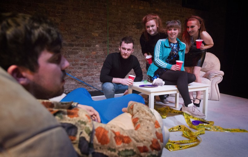 The second play Sucking Dublin tells the story of five very different individuals; Little Lamb, Amanda, Steve, Lep and Fat. We are introduced to them on the evening of Lamb’s 18th birthday party where they are having a wild celebration. The party is filled with the usual high jinks until Steve shocks the other members of the group. This is a more ambitious production with five cast members. It carries on in a similar vibrant and exuberant style as the earlier production but unfortunately never hits the heights. The cast do their best but this is not Walsh’s finest work and seems a little dated and derivative. It was written a few years after Trainspotting and has a similar style. However, it is not possible to tell the story of five people in a short play, so it is difficult to get under the skin of the characters. We instead get a view into their lives with a series of brief vignettes.