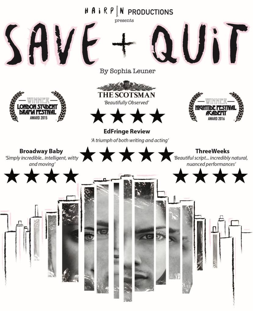 Sophia Leuner explores this and various other frustrations of modern life in the now well-travelled ‘Save + Quit’. It’s a two parter – the first half set in London, and the second Dublin – told largely through non-intersecting monologues. The first halves’ two characters meet only through a chance encounter; while the second’s are in a relationship-of-sorts but rarely communicate. The result is a fascinating investigation into the conflict between our inner and outer selves, and the dysfunction this can create.