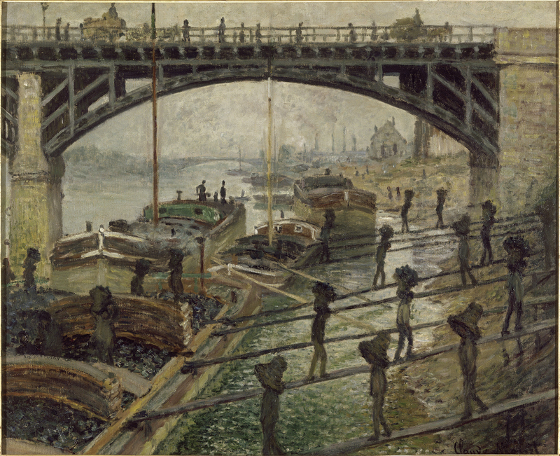 By 1878 Monet and his family had settled at Vétheuil, about a hundred kilometres northwest of Paris, where the town’s historic church, with a 14th-century tower and Renaissance-style façade, was the main attraction. Here, particularly in the second of the two paintings of the church, he includes more mundane buildings and ordinary people going about their lives. In time, his paintings began increasingly to move away from the picturesque towards more industrial landscapes, including elements of modernity that were introducing into the natural environment, and it is here in the exhibition where the power of the man’s vision comes to the fore. By 1877 he is painting amazing pictures of the Gare St-Lazare and labourers moving coal from barges at Asnières where the natural environment is completely overshadowed by man-made elements.