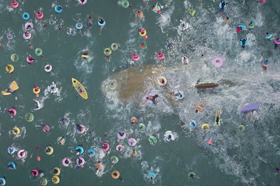 Then we traveled to China, which was awesome because it’s a great place to go if you need five thousand Chinese people on a beach and swimming in the ocean (laughs). During our research, we saw photographs of thousands of people smashed in together on innertubes at some beaches in China. And we thought, “That looks like a bowl of snacks for a megalodon!” So, it seemed like the right place to capture a specific scene.