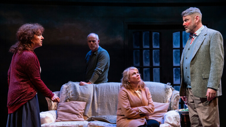 An unusual feature of this production is the inclusion of a trans character in the form of Dairne (Rebecca Root) who was once known as David and was a childhood friend of Sandra. The characters have a long history together but have drifted apart in recent years. Dairne is a wild card in the pack and a source of much of the humour in the early part of the play. It is definitely a positive to see more diversity on the Abbey stage and it did add some depth to what would have been a very traditional minor character otherwise.