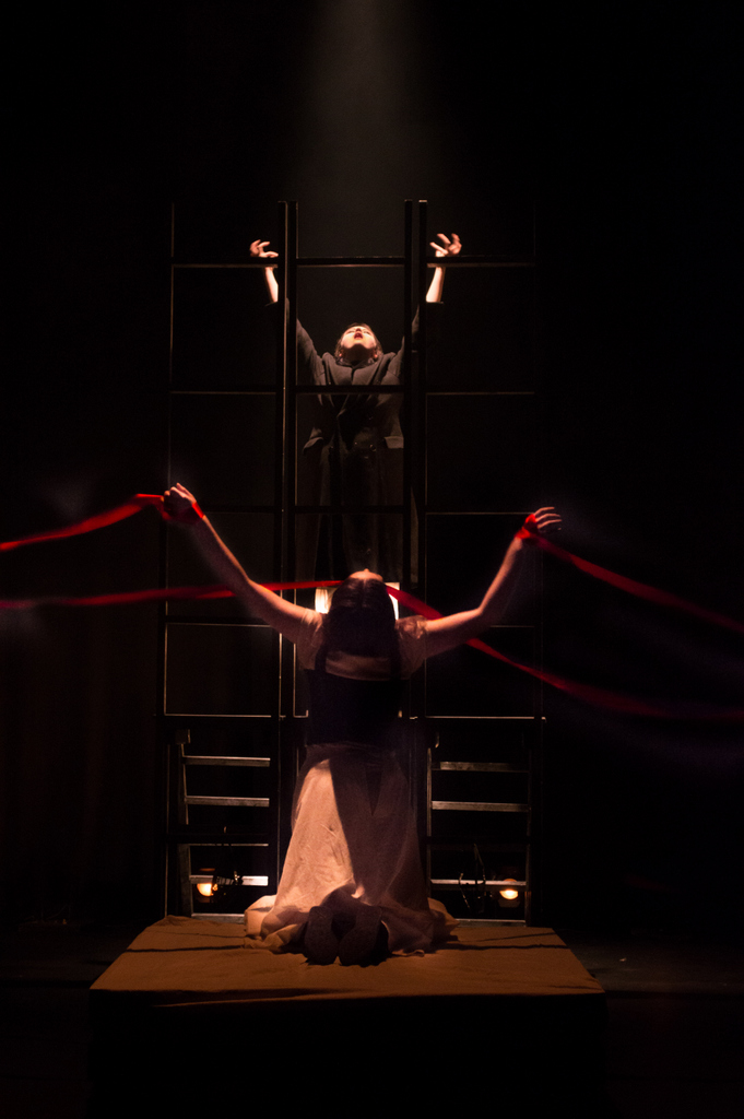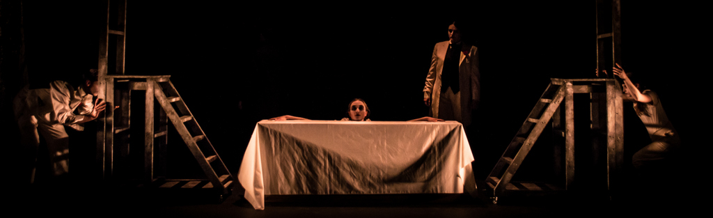 This is a production by Quintessence Theatre (in association with An Táin Arts Centre) who describe themselves as a “physical ensemble”. There are five actors on stage who create a large number of locations and settings with minimal props. They create insane asylums, houses, schools and castles using only a few wooden crates and some portable steel stairs.