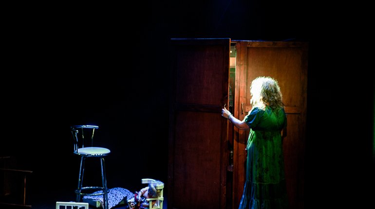 The set is unusual but it works. It consists of a large wardrobe with two doors, standing on one side of the stage. From it, Mahon emerges. Within it is a treasure trove of memorabilia which relate directly or indirectly to her mother including a folding table, a doll, a miniature chair and bed, a bunch of flowers, a half drunk bottle of Jameson and much else besides. Mahon disappears into the wardrobe from time to time to bring out onto the stage various cherished items. Although the objects are disparate they create the visual clues which illuminate the story. Mahon uses them to telling effect as the mother gradually succumbs to the complexities of dementia. The immense love of Mahon for her mother imbues the entire story but she does not shy away from the moments of fear and frustration which inevitably confronts an individual whose role is that of primary carer. There are many moments where the only sensible reaction is that of a benign smile.