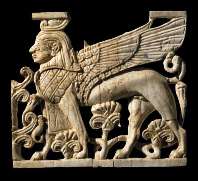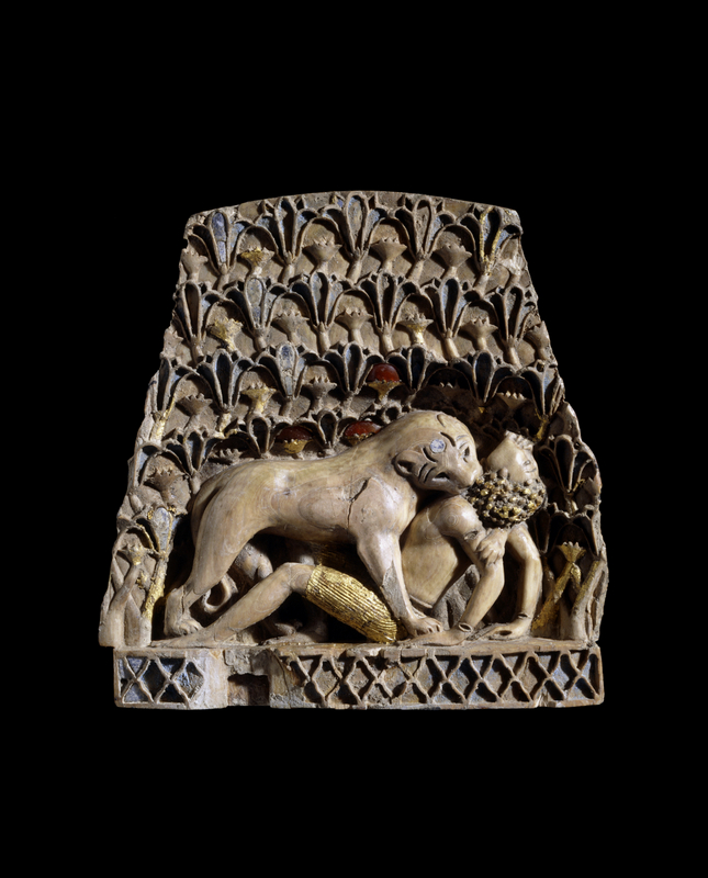 1. Lioness plaque Ivory plaque of a lioness mauling a man, ivory, gold, cornelian, lapis lazuli, Nimrud, 900BC – 700BC © The Trustees of the British Museum
