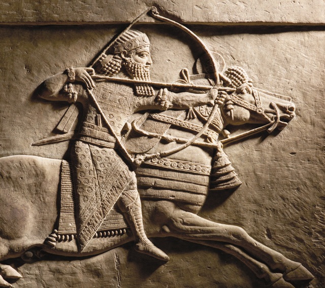 2. Relief detail of Ashurbanipal hunting on horseback. Nineveh, Assyria, 645–635 BC © The Trustees of the British Museum