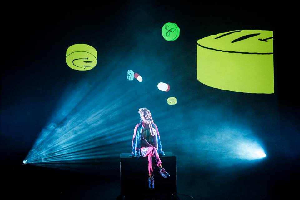 This one woman play was originally part of the Dublin Fringe Festival in 2017 and was one of the ‘Show in a Bag‘ series. It was performed in the small venue of Bewley’s Café Theatre. This new production is on the main stage of the Project Arts Centre and is a more lavish affair, with impressive lighting and visuals. The production has the unusual feature of a live DJ on stage throughout, with DJ Handsome Paddy adding to the proceedings.