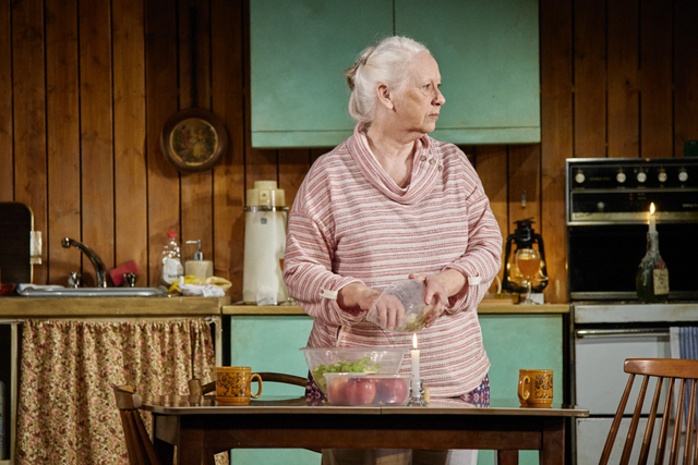 The play takes place in the kitchen of the holiday home. Sarah Bacon has created an impressive rendition of a lacklustre house with wood panelling on the walls and ugly green cupboards in the kitchen. It makes the play seem timeless and works well.