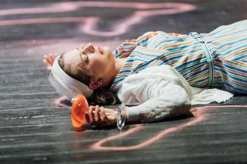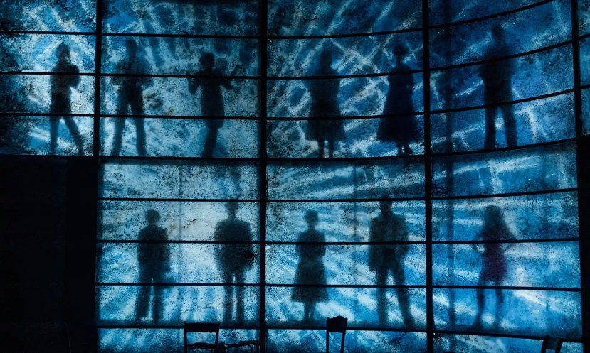 The set was designed by Richard Kent and it is quite inventive with a transparent back wall. This allows us to see what is happening back stage, as those mentioned in the text appear above the heads of the actors.