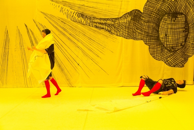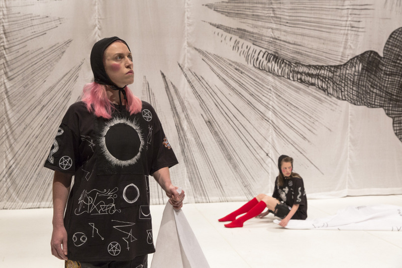 My friend and I stand and turn to look at each other after the hour long performance of For Now We See Through A Mirror, Darkly in the Project Arts Centre, we tilt our necks and stretch our arms in an effort to decompress their tightened muscles; it is as if watching a show, normally a passive and effortless experience, had put us through some gruelling workout. Walking away from the theatre we agree on the riveting and intriguing nature of “this eerie and mystical dance performance” as Louise Ahl (Ultimate Dancer), its creator describes it in the notes to the programme of the Live Collision Festival. Above all though, we comment on the effect of the intense physicality of the performances, which at times I watched as tensely as if witnessing a tight rope walker suspended in mid-air about to risk a disastrous fall. The title of this mixture of dance and live performance art points at Louise Ahl’s interest in the metaphysical and mystical by alluding to the well-known passage by Saint Paul in Corinthians where he points at the imperfections and distortions of our earthly experiences. It also foregrounds her collaborator Juliana Cape’s work with the visually impaired. The strong physical and sensorial nature of the piece highlights these concerns from its very beginning, with three mysterious, and mysteriously clad, figures played by Ultimate Dancer, Jo Hellier and Peter McMaster, positioned on a bare stage against a backdrop featuring what look like two explosions and a heart shape that is later revealed as a two pronged snake tongue. For a few minutes the three performers, kneel, sit and stand in triangular formation, whilst clutching pieces of canvas with cryptic symbols and letters painted on them. Their bodies barely move with the exception of some mechanical neck craning but the eyes of Ultimate Dancer and Jo Hellier dart around the room to occasionally fix a piercing stare at some point beyond the audience, as if able to see something that stands behind us or before us that we cannot see ourselves. It is an unnerving and intriguing opening and it sets the tone for this intense and minutely imagined piece.