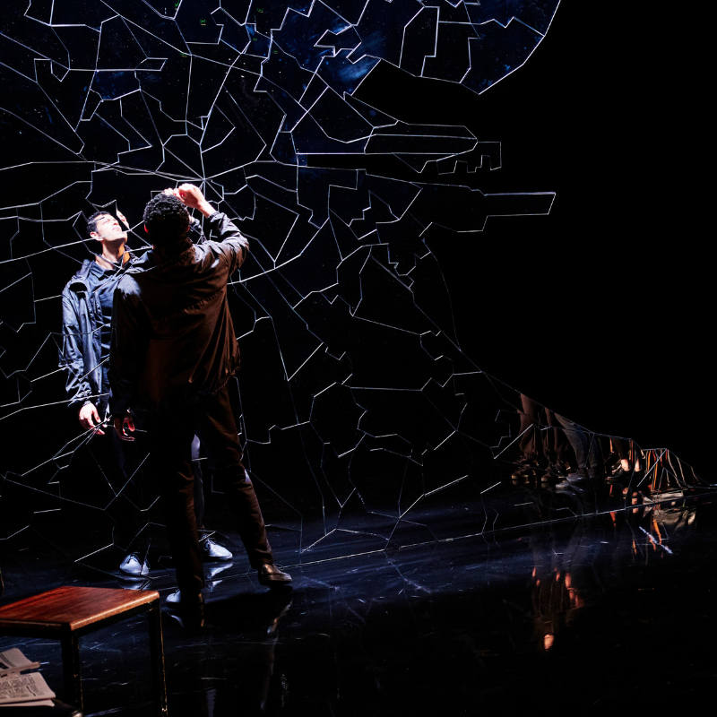 The main stage of the Abbey is altered to create a more intimate space, with the first few rows of seats removed and the stage moved out towards the audience. The only real prop on stage is a large metallic backdrop in the shape of Dublin city itself, along with a few chairs.