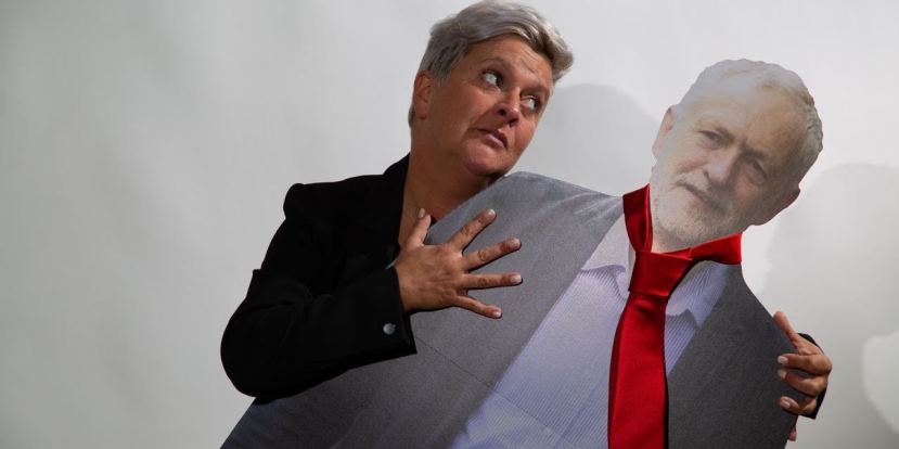 Following a sparky opening montage of Theresa’s resignation speech, sound tracked by the classic weepy hit ‘All By Myself’, we find ourselves in Theresa’s office, where she is musing on her premiership, complaining about Dim Dave, Bo-Jo and the ‘Euro-Septics’ and writing that very speech. She is quite literally all by herself, with no company save for a bottle of whiskey, a telephone and a cardboard cut out of her arch nemesis Jeremy Corbyn.